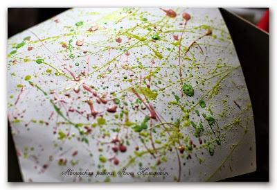 Ключевой момент!!! :) Коробка! Нужна такая, в которую поместится наш лист, и желательно с высокими бортиками. После использования, я коробку собираю и она живёт за шкафом до следующего сеанса :) И самое увлекательное - начинаем набирать краску на кисть и делать набрызг на бумаге. Не боимся экспериментировать! В процессе будет понятно какие капли и потёки образуются при том или ином взмахе рукой или кистью. У меня после двух листов даже кисть руки ныла от "зарядки"